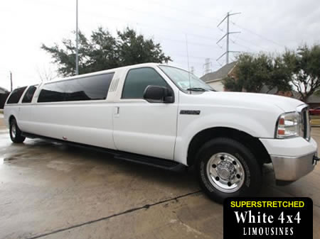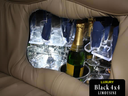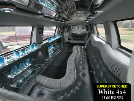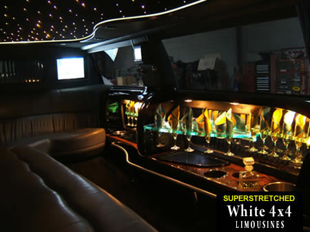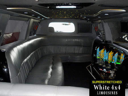 This white 4x4 'Hummer' limo is fitted with leather seats, amazing CD stereo and speakers, mirror ceilings, ice buckets, champagne flutes and tinted windows!